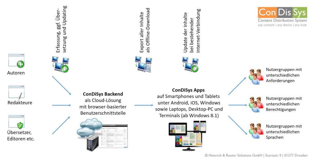 In order to do justice to the scope of functions and possibilities that have arisen in the meantime, we are continuing the project under the name “ConDiSys” (abbreviation for Content Distribution System), because that is exactly what the combination of databases, front end for content maintenance and customizable app Packages for all platforms. It is possible to provide content in a multimedia, multilingual, cross-platform and offline-compatible manner.