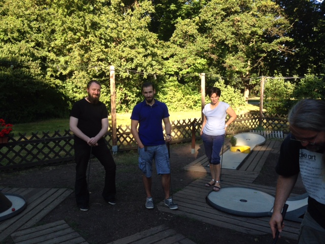 Nach dem Spaziergang in der heißen Mittagssonne war erstmal Abkühlung gefragt und so wurde bei einem kühlen Getränk in der Sonne entspannt. Nach der kleinen Erholungspause ging es dann zum nächsten Programmpunkt – Minigolf. In gelosten Teams wurde mit viel Freude Beraten, Behindert und der Abschlag geübt.