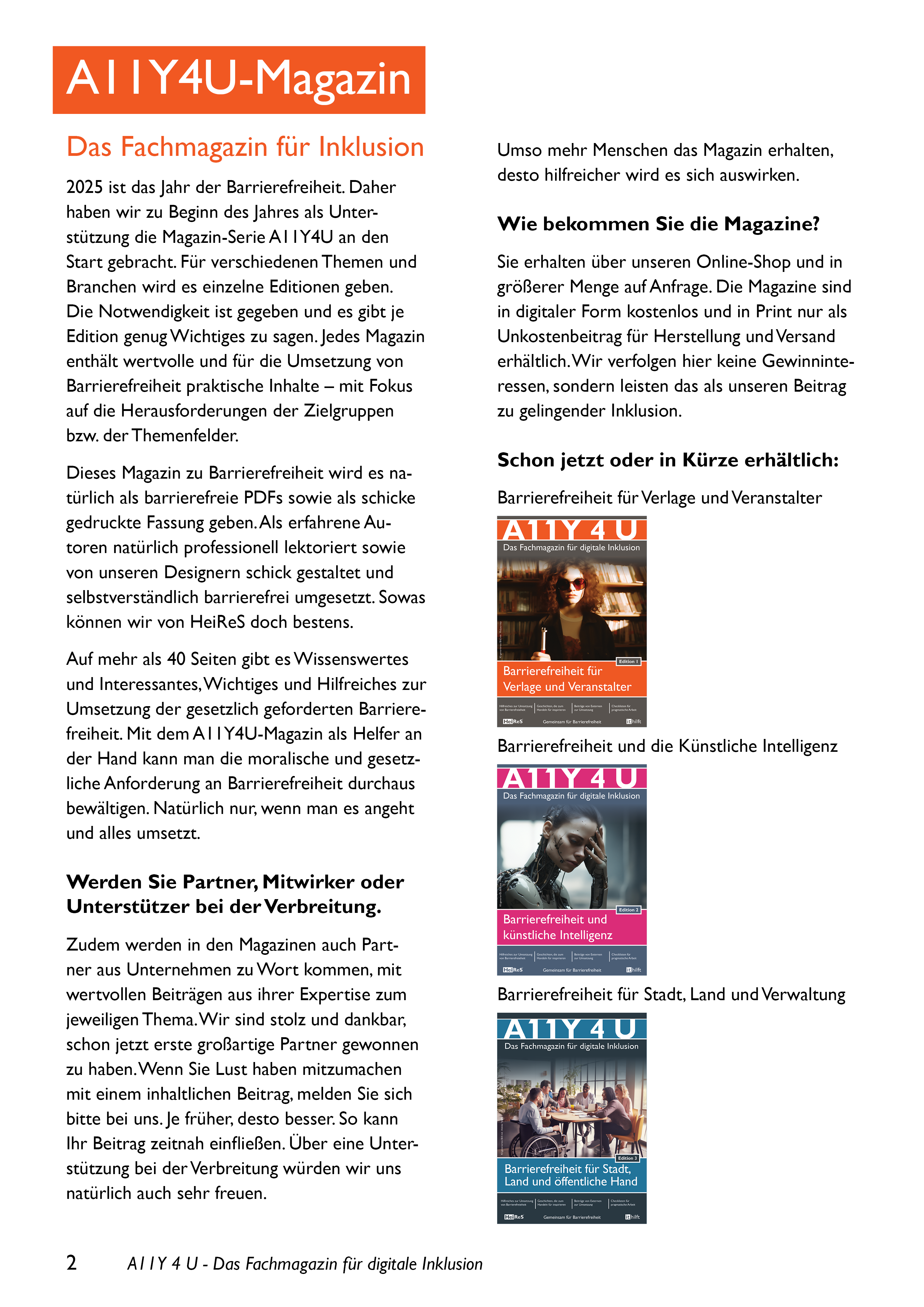Das neue Fachmagazin A11Y4U „Barrierefreiheit für Verlage und Veranstalter“ ist ab sofort erhältlich – als gedrucktes Magazin sowie als barrierefreies PDF zum Herunterladen. Erfahren Sie für Ihre Branche alles Wichtige rund um das Thema digitale Barrierefreiheit, insbesondere mit Blick auf das Barrierefreiheitsstärkungsgesetz (BFSG), das am 28.06.2025 in Kraft tritt.