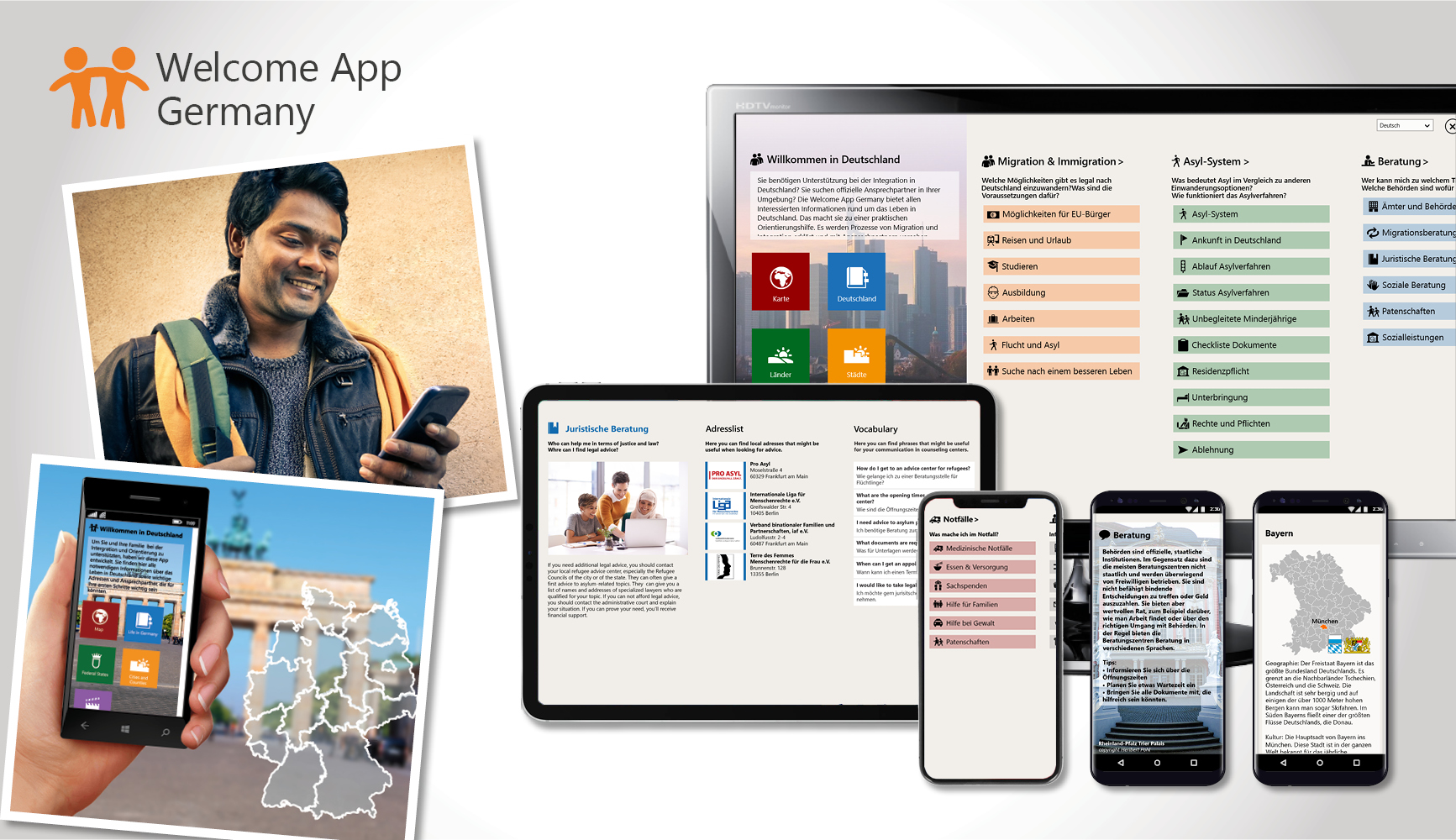 Die Welcome App Germany bietet gezielte Hilfestellung und bessere Verständigung in über 10 Basissprachen. Flüchtlinge nutzen hauptsächlich Smartphones für Teilhabe am Leben deshalb gibt es die App auf alle 3 Plattformen. Sie dient der Erstorientierung und bietet Ansprechpartner in der Region sowie eine Orientierungskarte.